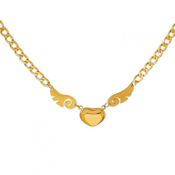 Náhrdelník Herz Wings Szépséges Herz wings nyakék verhetetlen áron. Az ékszer nem tartalmaz nikkelt, ezért érzékeny bőrű emberek is viselhetik. A különleges szívecskés és szárnyacskás díszítésével Önt is biztosan elbűvöli. Tulajdonságok: A nyakék hossza: 38cm + 4cm A díszítés mérete: 4,5cm x 0,9cm Anyaga: Nemesacél Szín: Arany