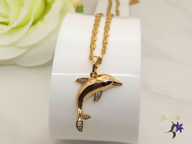 Goldfilled delfin medálos nyaklánc Szin: 18 Kr Méret: lánc 50 cm /2mm nagyon szép lánc Medál: 3x1,5 cm Zár: delfinkapocs A forgalmazott divatékszerek alapanyaga nikkel és ólommentes ezért többnyire nem okoznak allergiás tüneteket, nyugodtan hordhatják fémérzékeny emberek is. Általában nem színezik a bőrt és más divatékszerekhez képest nagyságrendekkel jobb kopásállós