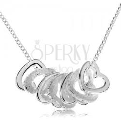 925 ezüst nyakék apró ovális szemekből álló láncból és hét medálból egyenletes szív kontúrokból. A sima, fényes szív körvonalak a szemcsés felületűekkel váltakoznak. A nyakék hossza állítható és delfinkapoccsal záródik. Egy szív méretei: 8 x 8 mmEgy medál súlya: 0,3 g (összesen 2,1 g)A lánc szélessége: 1 mmA lánc hossza: 450 mmA lánc súlya: 1,5 gFémjelzés