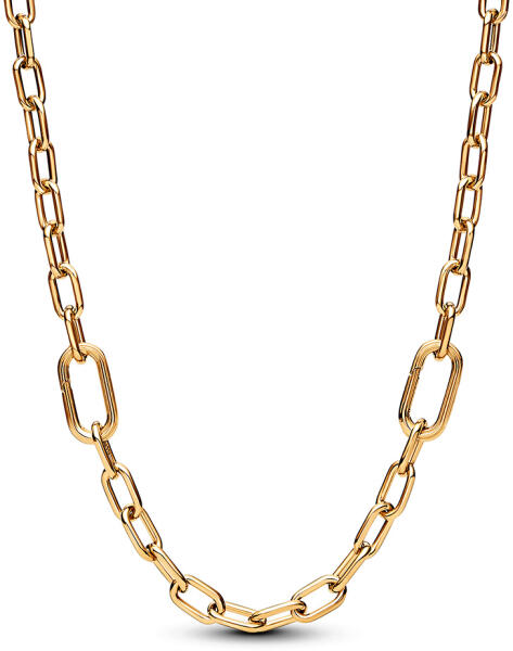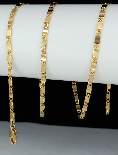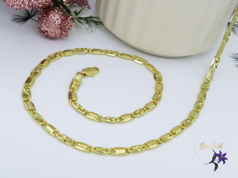Aranyszínű lapos szemes nyaklánc, melyet homorú nyomat díszít. A nyaklánc mindkét oldala mintás. Időtálló ékszer, amit fürdéskor sem kell levenni, bátran viselhető folyamatosan ("gold filled"). Antiallergén ékszer. 18K arany színben kapható. Az antiallergén ékszerek olyan fémötvözetből készülnek, melyek nem irritálják a bőrt, nem okoznak allergiás reakciókat, ezé