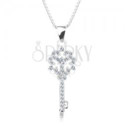 925 ezüst nyakék, melyet egy vékony nyaklánc alkot szögletes szemekből, valamint egy medál díszes kulcs formában. A medál felszíne apró, áttetsző cirkóniákkal van kirakva. A kulcs felső része virág alakú, dísszel a közepén. A lánc delfinkapoccsal van ellátva és métere állítható. Medál mérete: 10 x 25 mmMedál súlya: 1,6 gNyaklánc szélessége: 1 mmNyaklánc hossza