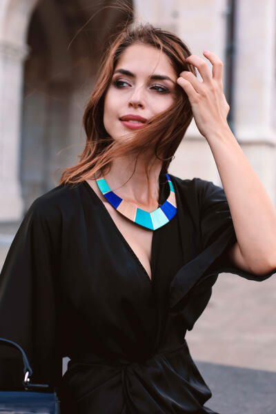 Hímzőfonalból és újrahasznosított műanyagból készült nyakék a páva színebien.