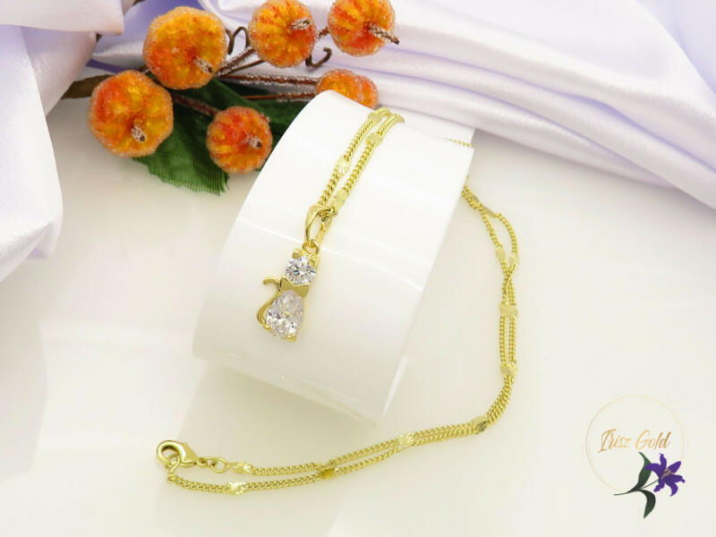 Goldfilled fehér cirkóna kőből cica medál, szép metszett díszítésű nyaklánc jár hozzá Szin: 14K Méret: 55cm/ 2mm Medál: 20x10mm A forgalmazott divatékszerek alapanyaga nikkel és ólommentes ezért többnyire nem okoznak allergiás tüneteket, nyugodtan hordhatják fémérzékeny emberek is. Általában nem színezik a bőrt és más divatékszerekhez képest nagyságrendekkel jobb