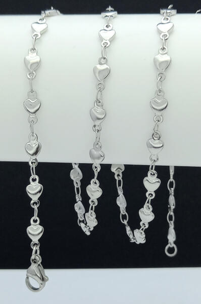 Ezüstszínű nemesacél ( 316L ) szív alakú szemekből kialakított nyaklánc. Időtálló ékszer, amit fürdéskor sem kell levenni, bátran viselhető folyamatosan. Antiallergén ékszer. Nyaklánc hossza: 50 cm. Nyaklánc szélessége: 5 mm. A nyaklánc rövidíthető, melyet ajéndékként elvégzünk. A kért méretet kérjük a megjegyzés rovatban feltüntetni. A nemesacél ékszerek re