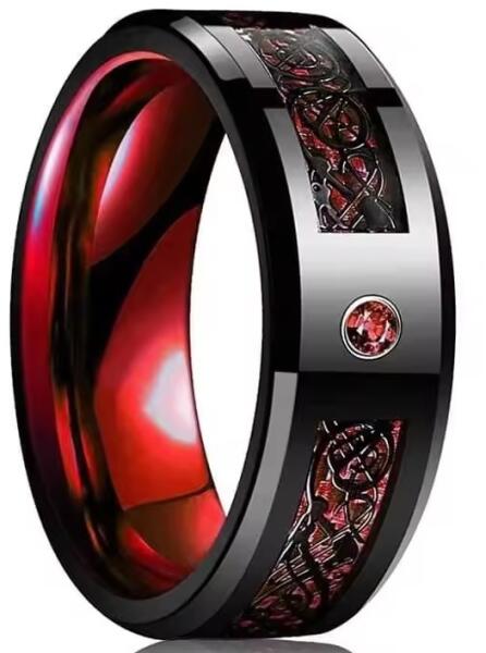 Garniture Gyűrű Egyedi gyűrű uraknak, mely kombinálja a modern esztétikát a kelta misztikával. Ezzel egy olyan ékszer keletkezik, ami nem csak vonzza a tekintetet, hanem szimbolikával teli. A gyűrű középső sávja piros színű, kelta szimbólumokkal díszített. A fő díszítőelem a fekete színű fémbe ültetett piros színű cirkónia ékkő, ami fényűző hatást visz a gyűr