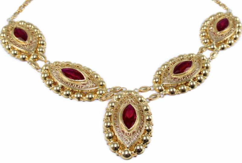 Modern stílusú, piros kővel ékített, áttört kialakítású, görög mintás, galériás jellegű arany verlauf.