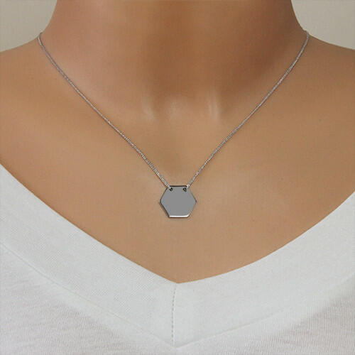 A 925 ezüst nyakláncot egy medál díszíti, amely szimmetrikus hatszög alakú. A ruténium felületkezelés szürke színárnyalatot kölcsönöz a nyakláncnak. A medál felülete fényes és sima. A láncot szorosan egymással összekapcsolt láncszemek alkotják. Nyaklánc rugós karika zárszerkezettel. A medál mérete: 17 x 17 mmA lánc szélessége: 1 mmA nyaklánc hossza: 410 mm (+/- 5