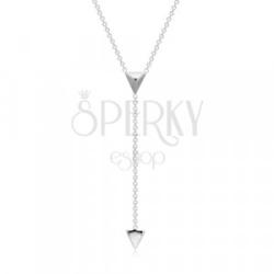 A 925 ezüst nyaklánc egy láncból és egy dekoratív részből áll geometrikus motívummal. A lánc egymásra merőlegesen összekapcsolt, ovális szemekből áll. A lánc közepén egy térbeli háromszög található, amelynek középső csúcsa lefelé van fordítva. A térbeli háromszög hátulja be van süllyesztve. A rövidebb láncon egy kisebb piramis függ. Delfinkapcsos zárszerkeze