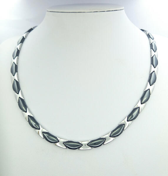 Ezüstszínű nemesacél (316L) nyakék, fekete kerámia díszítő szemekkel. A nemesacél előnyös tulajdonságainak ( nem kopik, nem feketedik, nem okoz allergiát ) és a kerámia szépségének ötvözése ez a mutatós nyakék. A kerámia anyagában színezett, tartós, nem törik. Prémium minőségű, antiallergén ékszer. Nyakék hossza: 49,5 cm. Nyakék szélessége: 7 mm. A nemesacél