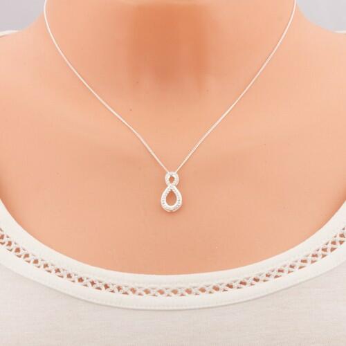 A 925 ezüst nyaklánc egy láncból tevődik össze ellipszis alakú szemekkel, amelyen egy nyolcas alakú medál függ. A medál apró, kerek, átlátszó cirkóniákkal van díszítve. A nyakláncnak állítható hossza és delfinkapcsos zárszerkezete van. Medál méretei: 10 x 20 mmMedál súlya: 0,96 gLánc szélessége: 1 mmLánc max. hossza: 450 mm (+/- 5 %)Lánc súlya: 1,48 gFémjelzéss