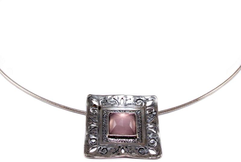 Kedvelt fazonú, négyzet alakú, antikolással, áttört mintával, középen ametiszt kővel díszített ezüst medál kígyólánccal kombinálva.