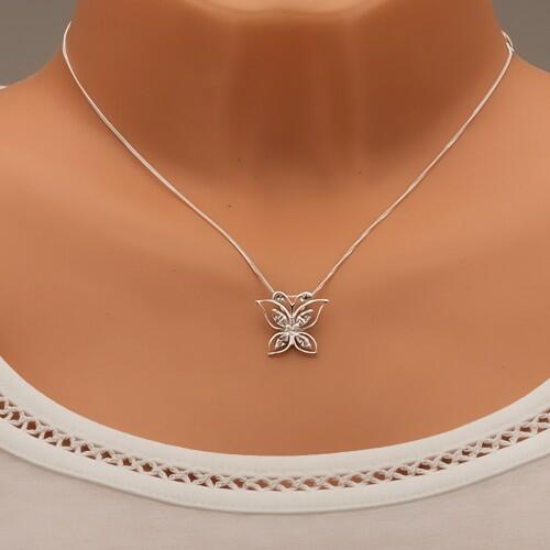 925 ezüst nyakék, amelyet finom lánc alkot apró, ovális szemekkel és egy pillangó medál tekert szarvakkal, amelyek közepébe kerek, átlátszó cirkóniák vannak ültetve. A pillangó szárnyai vékony körvonal alakúak átlátszó magszem alakú cirkóniákkal. A nyakék hossza állítható és delfinkapoccsal záródik. A medál méretei: 20 x 17 mmA medál súlya: 1,4 gA lánc széle