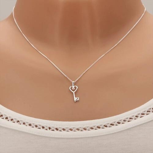 Nyakék 925 ezüstből enyhe órégi kulcs alakú medállal. A medál felszíne sima és fényes, a első részét szívkörvonal alkotja kerek átlátszó cirkóniával. A lánc hossza állítható, delfinkapcsolás. A medál méretei: 7 x 17 mm A medál súlya: 0,47 gA lánc szélessége: 1 mmA lánc hossza: 400 mmPlusz hossz: 50 mm Teljes hossz kihúzással: 450 mm (+/- 5 %) A lánc súlya: 1,4