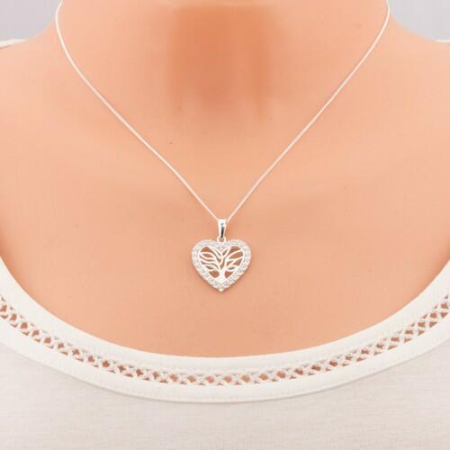 A 925 ezüst nyaklánc ellipszis alakú szemekből álló, finom láncból tevődik össze, amelyen egy nagy, szimmetrikus szív alakú medál függ. A szív körvonala kerek, átlátszó cirkóniákkal van kirakva és a közepén egy terebélyes életfa található. Delfinkapcsos zárszerkezet. Medál méretei: 21 x 21 mmMedál súlya: 2,5 gLánc szélessége: 1 mmLánc max. hossza: 450 mm (+/- 5