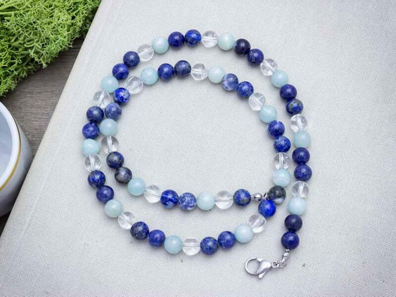 Ezt a szerencsehozó nyakláncot kifejezette n a halak jegy szülötteinek terveztük, készítettük. A nyaklánc halak (02.20. - 03.20. ) jegyhez passzoló hegyikristály, lápisz lazuli, amazonit és szodalit 6 mm-es ásvány gyöngyökből áll. Halak (02.20. - 03.20. ) horoszkóp jellemzése: E jegy szülöttje intenzív lelki életet él. Általában a pillanatnyi hangulat hatására cseleks