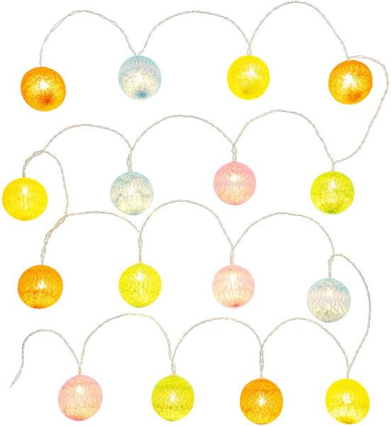 Színes gyapjúgolyók. Időzítő: 6/18 óra. Kábel teljes hossza: 3,3 m. A világító kábel hossza: 3 m. A tápkábel hossza: 0,3 m. Elemtípus: 2x AA (nem tartozék). Fény színe: meleg fehér. LED-ek száma: 16. Beltéri használatra.