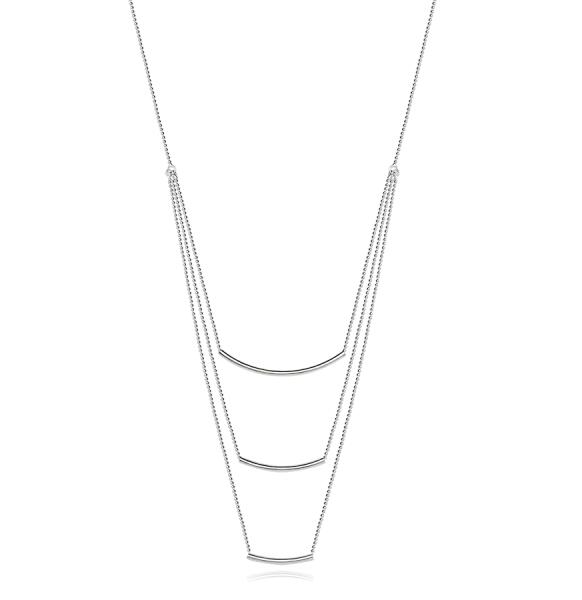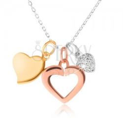 Nyaklánc 925 ezüstből, állítható méretben, ferdén kapcsolt apró szemű láncból és három fényes szív alakú medálból. A legnagyobb medál egy szívkörvonal, bronz színben. A másik egy lapos, asszimetrikus szív, arany színben. A legkisebb szívecske enyhén domború és az egyik oldaláról apró tiszta kövekkel díszített. Delfinkapocs zárás. A medálok méretei (bronz, ar