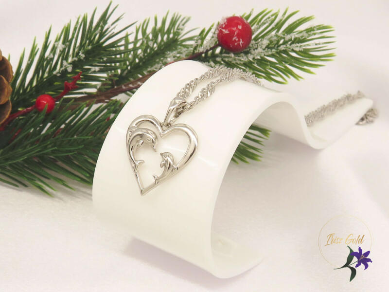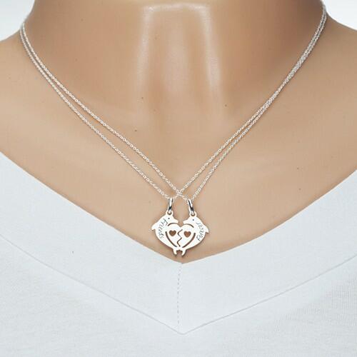 A 925 ezüst nyakék két keskeny láncból és kettős medálból tevődik össze - lapos kettétört szív, amelyet két egymással szembe fordított delfin alakja alkot. A szív mindkét felét gravírozott feliratok díszítik "Friends" - "Barátok" és "Forever" - "Mindörökké". A nyakék hossza állítható. Delfinkapoccsal záródik. A kettős medál méretei: 22 x 16 mmA kettős medál s