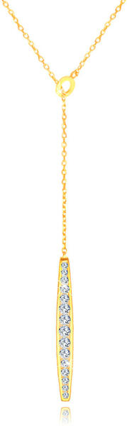A 14K sárga arany nyakláncot egy hosszúkás ellipszis alakú medál díszíti, amely csónakra hasonlít. Az eleje cirkóniákkal van kirakva, amelyek átlátszóak és kör alakúak. A cirkóniák középen nagyobbak. A finom láncot ovális láncszemek alkotják, amelyek egymásra merőlegesen vannak összekötve. A nyaklánc hosszúsága állítható és rugós karika kapoccsal rendelkezik.