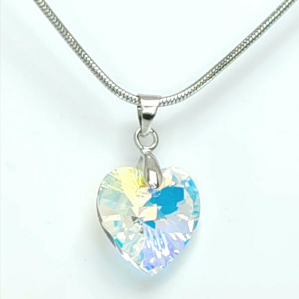 Ezüstszínű nemesacél (316L) nyaklánc, melyet csillogó, víztiszta fehér szív alakú Swarovski kristály medál díszít. Időtálló ékszer, nem kopik, víz hatására nem feketedik. Antiallergén ékszer. Nyaklánc hossza: 40 cm + 5 cm hosszabbító. Nyaklánc szélessége: 1,2 mm. Kristály mérete: 14 mm x 15 mm. A nemesacél ékszerek rendkívül népszerűek kedvező tulajdonságaik