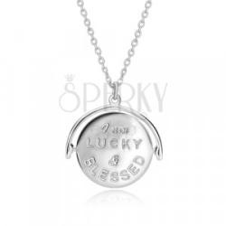 A 925 ezüst nyaklánc egy láncból és egy forgatható medálból áll. A láncot egyforma ovális szemek alkotják, amelyek egymásra merőlegesen vannak összekapcsolva. A medál lapos, fényes kör alakú, amely egy forgatható szerkezetbe van rögzítve. A kör egyik oldalán az "I am LUCKY & BLESSED", a másik oldalán pedig a "to HAVE U" felirat olvasható, amelyek együtt a következ