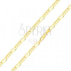 Figaro mintás nyaklánc 585 sárga aranyból. Váltakozó láncszemek három kis szem és egy nagyobb hosszúkás láncszem. Felülete fényes és sima. Zárszerkezete delfinkapcsos. Nyaklánc szélessége: 4,4 mmHossz: 500 mm (+/- 5 %)Záró láncszem szélessége: 2,3 mmSúly: 5,5 gFémjelzéssel ellátott.