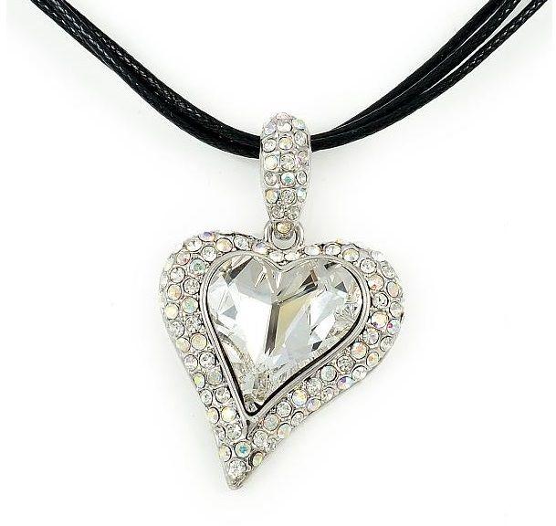 Cikkszám: 0362 Nyaklánc: - platina bevonattal, - állítható, 3 soros, fekete színű bőrszíjjal (40 cm - 45 cm), - áttetsző Swarovski kristályokkal. Súlya: 10 g. A medál mérete: 2,5 cm x 3,5 cm. Gyönyörű, exkluzív, Swarovski kristályos divatékszer!