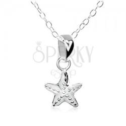 925 ezüst nyakék, ferdén összekapcsolt, ovális szemekből álló láncból, amelyen egy ötágú csillag alakú medál van keresztül fűzve. A csillag minden egyes ága gravírozott golyók vonalával díszített a hátsó oldalról pedig üreges. A nyakék delfinkapoccsal záródik és a hossza állítható. A medál méretei: 8 x 8 mmA medál súlya: 0,4 gA lánc szélessége: 1 mmA lánc