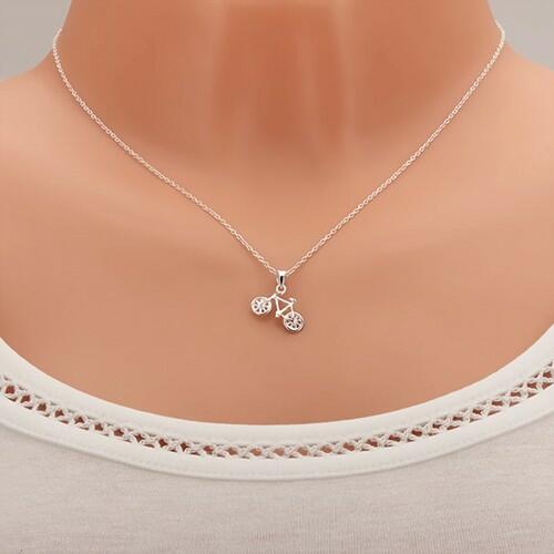 925 ezüst nyakék, ferdén összekapcsolt, ovális szemekből álló láncból és fényes medálból. A medál bicikli alakú, amelynek kivágott váza, kerekei és pedáljai vannak. A láncra kerülő szem a kormányhoz van erősítve. A hossz állítható és delfinkapoccsal záródik. A medál méretei: 13 x 12 mmA medál súlya: 0,57 gA lánc szélessége: 1 mmA lánc hossza: 450 mmA lánc s