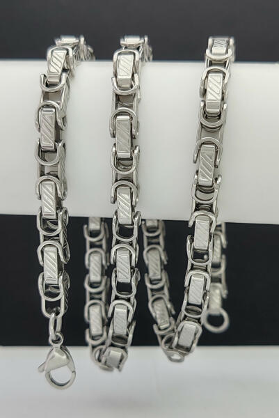 Ezüstszínű nemesacél (316L) királylánc, melyet metszett csíkos minta díszít. Minőségi anyagának köszönhetően nem feketedik. Időtálló ékszer, amit fürdéskor sem kell levenni, bátran viselhető folyamatosan. Antiallergén ékszer. Nyaklánc hossza: 60 cm. Nyaklánc szélessége: 6 mm. Igény esetén rövidíthető, melyet ajándékként elvégzünk, a kért méretet kérjük a