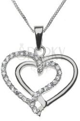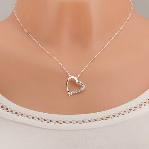 Nyakék 925 ezüstből állítható hosszal apró egymásra merőlegesen elhelyezett szemekkel és fényes asszimetrikus szív alakú medállal. A szív jobb oldala csillogó átlátszó cirkóniákkal díszített. A medál fényes felszínű, a láncon ferdén függ. Delfinkapoccsal záródik. A medál méretei: 19 x 21 mm A medál súlya: 0,7 gA lánc szélessége: 1,0 mmA lánc hossza: 400 mm P