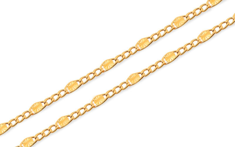 A sárga, tizennégy karátos aranyból készült lánc alkalmas hölgyek és urak számára egyaránt. A lánc mintája Figaro, lemezekkel, amelyeket finom gravírozás díszít. Az alkalmazott zártípus rugós karika, a biztonságos és kényelmes viselés érdekében.
