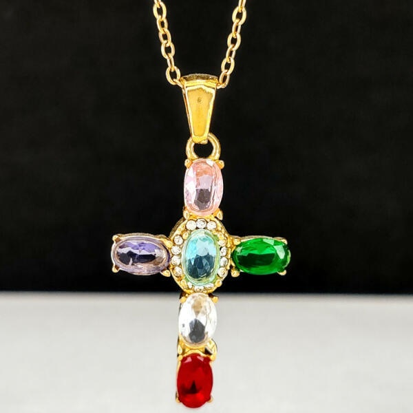 Aranyszínű nemesacél ( 316L ) nyaklánc, kereszt alakú nemesacél ( 316L ) medállal, melyet színes cirkónia kristályok tesznek csillogóvá. A kristályok karmos foglalatban helyezkednek el. Időtálló ékszer, amit fürdéskor sem kell levenni, bátran viselhető folyamatosan. Antiallergén ékszer. 14K arany színben kapható. Nyaklánc hossza: 40 cm + 5 cm hosszabbító. Nyaklánc szé