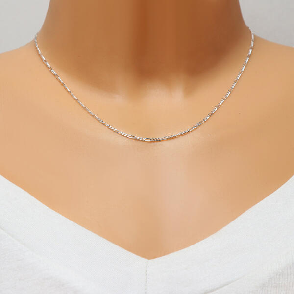 925 ezüst Figaro motívumú nyaklánc. A mintát három ovális és egy hosszúkás láncszemek váltakozása alkotja. A láncszemek a felső és az alsó részén kissé le vannak ferdítve. A lánc fényes felülettel rendelkezik. A lánc rugós gyűrűzárral rendelkezik. Láncszélesség: 1,6 mmLánc hossza: 410 mmHosszabbítás hossza: 50 mmTeljes hossza meghosszabbítással: 460 mm (+/- 5%)