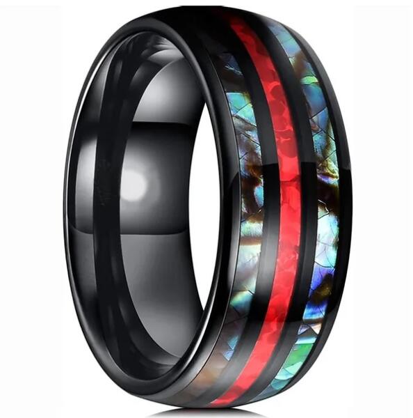 Prsteň Reuben Egyedi gyűrű, ami a modern kialakítást kombinálja a jellegzetes színekkel és kifinomultsággal. Ez a gyűrű a fekete színű fémet ötvözi a gyöngyházas és piros sávokkal, így nagyszerű példája a fényűzésnek és egyediségnek. Ez egy olyan ékszer, ami biztosan magára vonja a figyelmet és öltözékének különleges bájt kölcsönöz. Tulajdonságok: A gyűr