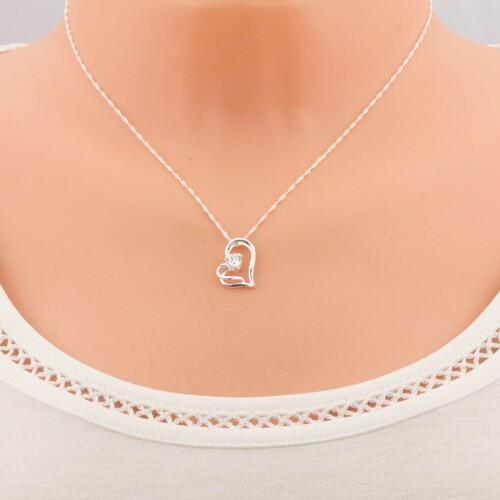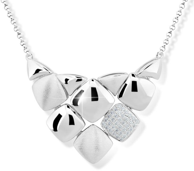 925 ezüst nyakék vékony nyakláncból, amely spirális alakú és medál függ rajta. A medál kettős, asszimmetrikus szív alak. A felső részen egy nagy kerek cirkónia heyezkedik el. A nyaklánc hossza állítható, delfinkapoccsal ellátva. Medál mérete: 14 x 17 mmNyaklánc szélesség: 1 mmLáncz hossza: 400 mm Plussz hossz: 50 mm Teljes hossz kihúzással: 450 mm (+/- 5 %) Nyaklánc s