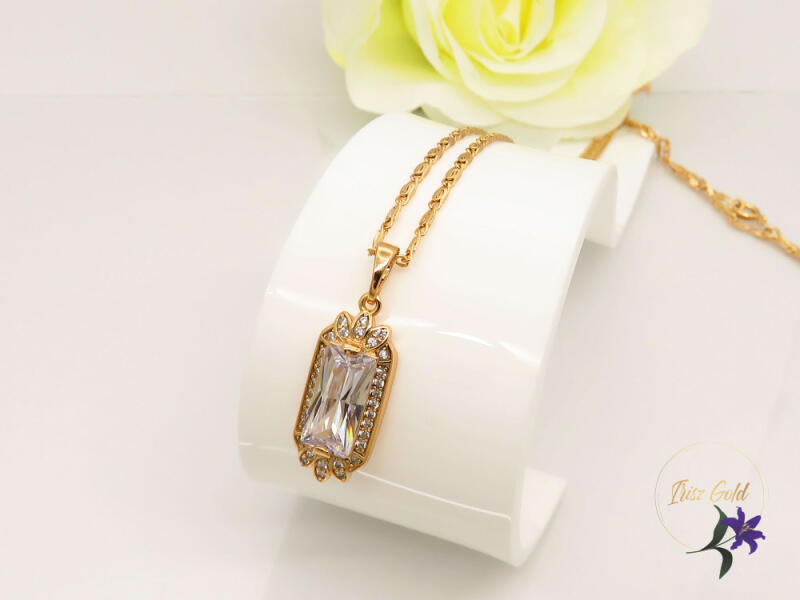 Goldfilled nyaklánc fehér hosszúkás kővel cirkóna foglalatban Szin: 18k Méret: 50cm / 3mm Medál: 23x12 mm A forgalmazott divatékszerek alapanyaga nikkel és ólommentes ezért többnyire nem okoznak allergiás tüneteket, nyugodtan hordhatják fémérzékeny emberek is. Általában nem színezik a bőrt és más divatékszerekhez képest nagyságrendekkel jobb kopásállósággal rendelke