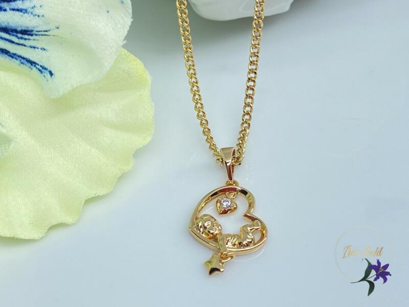 Szív alakú medál kisbabával. 55 cm nyaklánc jár hozzá. Ajándék diszdobozban, a doboz szine mintázata változhat. Szin: 18K Méret: 55cm /2mm Medál: 29x13mm A forgalmazott divatékszerek alapanyaga nikkel és ólommentes ezért többnyire nem okoznak allergiás tüneteket, nyugodtan hordhatják fémérzékeny emberek is. Általában nem színezik a bőrt és más divatékszerekhez képes