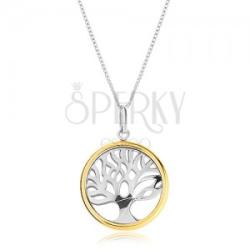 925 ezüst nyakék vékony ovális szemű nyaklánc, kétoldalas medállal. Arany színű karikában életfa terebélyes koronával. A nyaklánc hossza állítható és delfinkapocsos a zárszerkezete. Medál átmérője: 20 mmMedál súlya: 1,6 gNyaklánc szélesség: 1 mmMax. hossz: 450 mmNyaklánc súlya: 1,4 gFémjelzéssel ellátott.