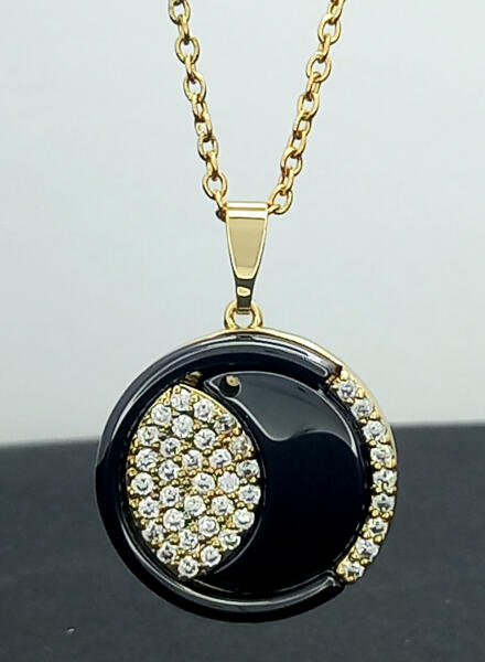 Kerek fekete kerámia és aranyszínű nemesacél (316L) medál különleges együttese. A medált szépen csillogó cirkónia kristályok díszítik. A kristályok karmos foglalatban helyezkednek el. A nyaklánc nemesacélból (316L) készült. A nemesacél és a kerámia előnyös tulajdonságainak köszönhetően nem törékeny, nem kopik. Tartós, minőségi antiallergén ékszer. 14K arany sz