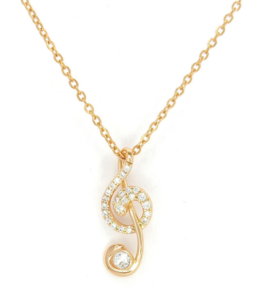 Aranyszínű nemesacél ( 316L ) nyaklánc, melyet fehér Swarorvski kristállyal díszített violin kulcs medál tesz csillogóvá. A kristályok karmos foglalatban helyezkednek el. Időtálló ékszer, nem feketedik, nem színezi a bőrt . Mindennapi használatra is tökéletes választás. Antiallergén ékszer. 18K arany színben kapható. Nyaklánc hossza: 40 cm + 5 cm hosszabbító. Nyaklán