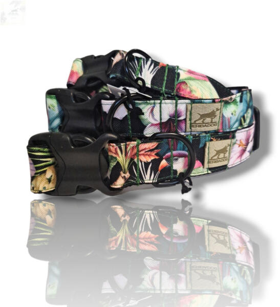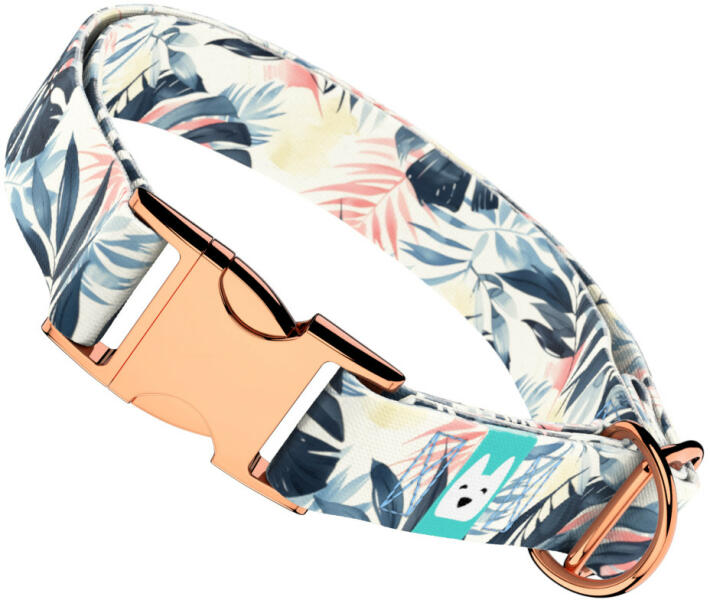 Trópusi levél mintás nyakörv kutyádnak különböző méretekben. Öltöztesd kedvenced hazai gyártású egyedi nyakörvünkbe, amit kérhettek trendi rose gold, mindig elegáns ezüst fém alkatrészekkel vagy könnyű műanyag csattal. Ahhoz, hogy ezeket a különleges mintákat meg tudjuk alkotni, műhelyünkben nyomtatjuk a hevedert. Minden terméket csak igény esetén gyártunk le, íg