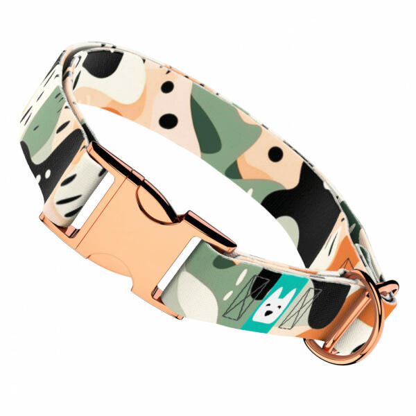 Absztrakt divatos terepmintás nyakörv kutyádnak különböző méretekben. Öltöztesd kedvenced hazai gyártású egyedi nyakörvünkbe, amit kérhettek trendi rose gold, mindig elegáns ezüst fém alkatrészekkel vagy könnyű műanyag csattal. Ahhoz, hogy ezeket a különleges mintákat meg tudjuk alkotni, műhelyünkben nyomtatjuk a hevedert. Minden terméket csak igény esetén gyártunk