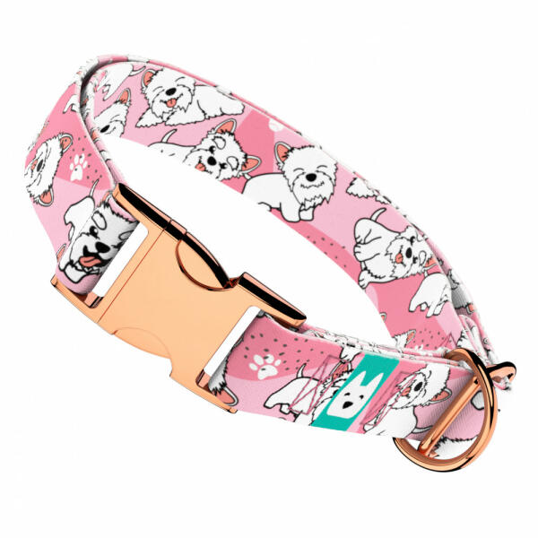 Westie mintás nyakörv kutyádnak különböző méretekben. Öltöztesd kedvenced hazai gyártású egyedi nyakörvünkbe, amit kérhettek trendi rose gold, mindig elegáns ezüst fém alkatrészekkel vagy könnyű műanyag csattal. Ahhoz, hogy ezeket a különleges mintákat meg tudjuk alkotni, műhelyünkben nyomtatjuk a hevedert. Minden terméket csak igény esetén gyártunk le, így elkerü