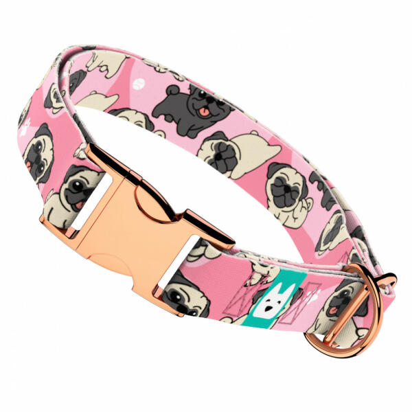 Cuki mopsz mintás nyakörv kutyádnak különböző méretekben. Öltöztesd kedvenced hazai gyártású egyedi nyakörvünkbe, amit kérhettek trendi rose gold, mindig elegáns ezüst fém alkatrészekkel vagy könnyű műanyag csattal. Ahhoz, hogy ezeket a különleges mintákat meg tudjuk alkotni, műhelyünkben nyomtatjuk a hevedert. Minden terméket csak igény esetén gyártunk le, így elk