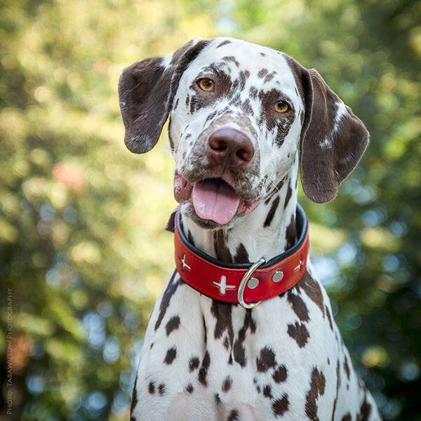 Kiváló minőségű bőrből készült nyakörv kutyáknak, kivágott keresztekkel fehér színű alapon. Szélesség: 4 cmNyakkerület: 34 - 41 cm