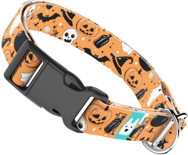 Halloweeni mintás nyakörv kutyádnak különböző méretekben. Öltöztesd kedvenced hazai gyártású egyedi nyakörvünkbe, amit kérhettek trendi rose gold, mindig elegáns ezüst fém alkatrészekkel vagy könnyű műanyag csattal. Ahhoz, hogy ezeket a különleges mintákat meg tudjuk alkotni, műhelyünkben nyomtatjuk a hevedert. Minden terméket csak igény esetén gyártunk le, így elk