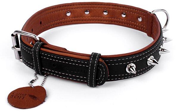 Fekete-barna színű SOFT bőr nyakörv kutyáknak, fém tüskékkel ellátva. Kézzel varrott és gyártott, kiváló minőségű kétrétegű nyakörv fém tüskékkel ellátva. A nyakörv természetes, különösen lágy bőrből készül. Minden kuytafajtának ajánlott, főként az érzékeny bőrűeknek, vagy azoknak, melyek allergiásak a nylonra. Nyakörv hossza: 46 - 60 cm Szélessége: 3