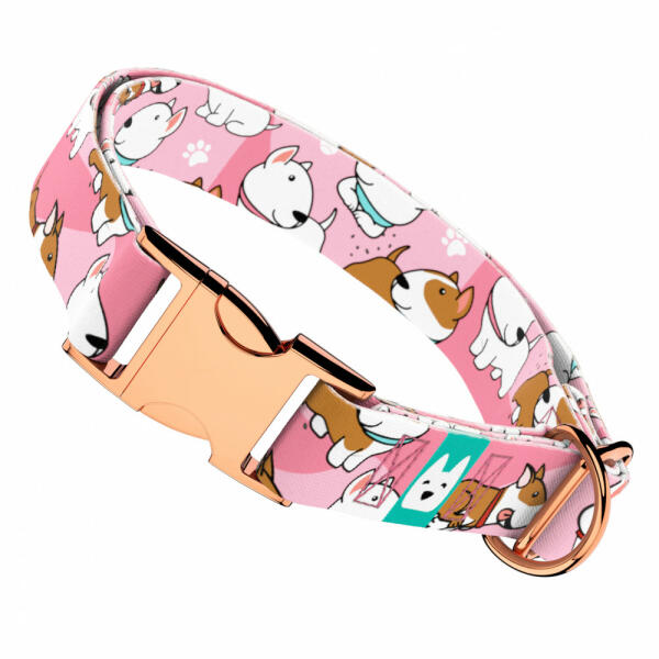 Bullterrier mintás nyakörv kutyádnak különböző méretekben. Öltöztesd kedvenced hazai gyártású egyedi nyakörvünkbe, amit kérhettek trendi rose gold, mindig elegáns ezüst fém alkatrészekkel vagy könnyű műanyag csattal. Ahhoz, hogy ezeket a különleges mintákat meg tudjuk alkotni, műhelyünkben nyomtatjuk a hevedert. Minden terméket csak igény esetén gyártunk le, így el