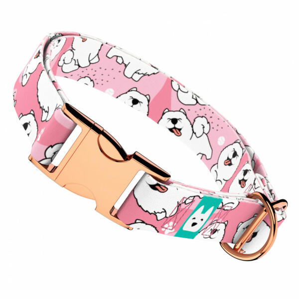Cuki szamojéd kutya mintás nyakörv kutyádnak különböző méretekben. Öltöztesd kedvenced hazai gyártású egyedi nyakörvünkbe, amit kérhettek trendi rose gold, mindig elegáns ezüst fém alkatrészekkel vagy könnyű műanyag csattal. Ahhoz, hogy ezeket a különleges mintákat meg tudjuk alkotni, műhelyünkben nyomtatjuk a hevedert. Minden terméket csak igény esetén gyártunk le